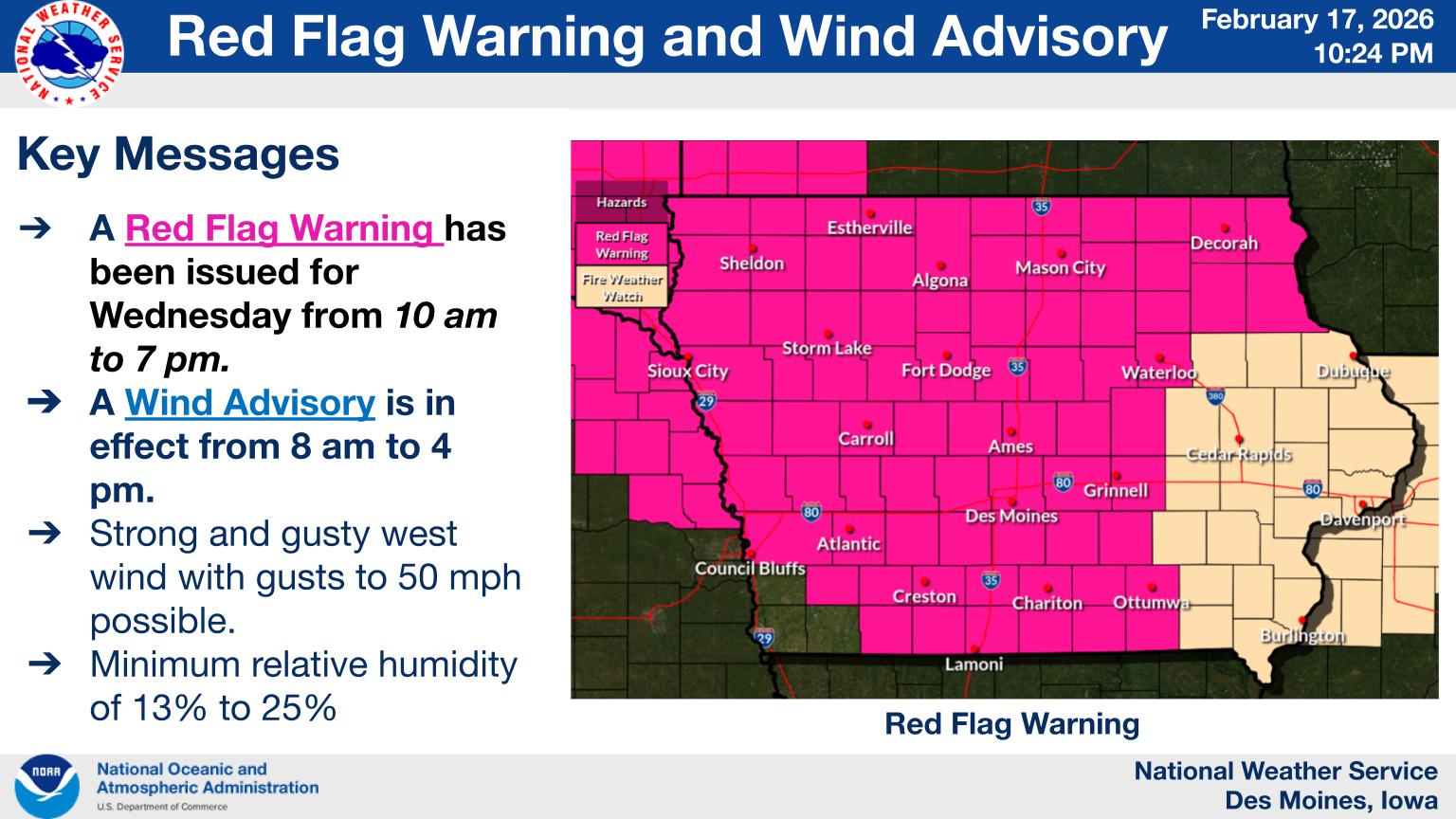 A RED FLAG WARNING IS IN EFFECT FROM 10 AM TO 7 PM TODAY FOR ALL IOWA COUNTIES (EXCEPT MILLS, FREMONT AND PAGE) – FOR CRITICAL FIRE WEATHER CONDITIONS.