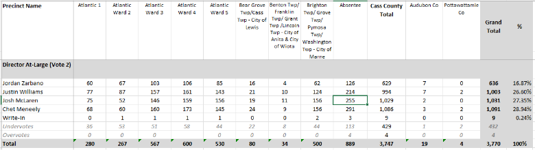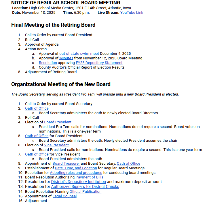 (Atlantic, IA) – The Cass County Board of Supervisors held a very brief Special Meeting this (Friday) afternoon with regard to a request to Order a recount of the Atlantic School District Director At-Large race from the November 4, 2025 City/School Election.