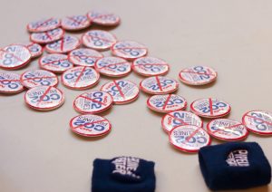 Pictured, Iowans opposed to carbon dioxide pipelines hand out buttons that read “No CO2 pipelines” at the Iowa State Capitol March 18, 2025. (Photo by Cami Koons/Iowa Capital Dispatch)