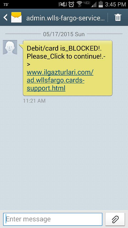 Wells Fargo’s website has numerous tips to prevent you from becoming a victim of fraud. They also have information about the scam mentioned in the text message: “A phishing attempt sent via SMS (Short Message Service) or text message to a mobile phone or device. This tactic is also referred to as smishing, which is a combination of SMS and phishing. The purpose of text message phishing is the same as traditional email phishing: convince recipients to share their confidential information.