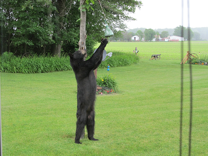 Bears are omnivores and their diet changes with the seasons. In the spring, bears emerge from their winter dens hungry. They’ll feed heavily on newly emerging tender grasses and sedges. In summer, its berries, ants, various plants, and grubs. In the fall, its acorns and other tree nuts. They are also known to feed on nontraditional sources, like row crops, orchard fruits, and honey – which is similar to striped skunks and raccoons. “They’re like a big raccoon, motivated by hunger and willing to take advantage of whatever food is available, from fawns to eggs, bee hives, bird feeders – this is where making some changes can minimize nuisance bear interactions,” he said.