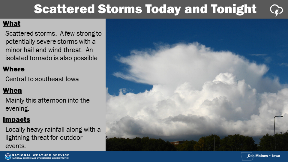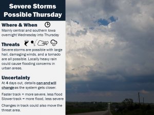 Storms will move into western Iowa very late Wednesday night and continue through the rest of the state on Thursday. The threat of severe weather continues across the southern half of the state with hail and damaging winds the main concern. An isolated tornado remains possible as well. Locally heavy rainfall could also cause flooding in urban areas. This is still a few days out and details may change, so stay tuned for updates as the forecast is fine tuned.”