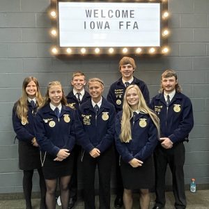 To receive the Iowa FFA Degree, FFA members must meet the following standards: 1) Have been an active FFA member for at least 24 months; 2) Have completed at least two years of systematic instruction in agricultural education; 3) Have earned and productively invested at least $1,500 or worked at least 375 hours in a supervised agricultural experience program; 4) Have a satisfactory scholastic record; 5) Have demonstrated leadership abilities from a specific list of activities; 6) Have completed 25 hours of community service; and 7) Have participated in at least five different FFA activities above the local level. This year Alyssa Derby, Caroline Pellett, Craig Alan Becker, Garrett Reynolds, Gunner Kirchhoff, Hannah Carlson and Taylor McCreedy have earned this prestigious award.