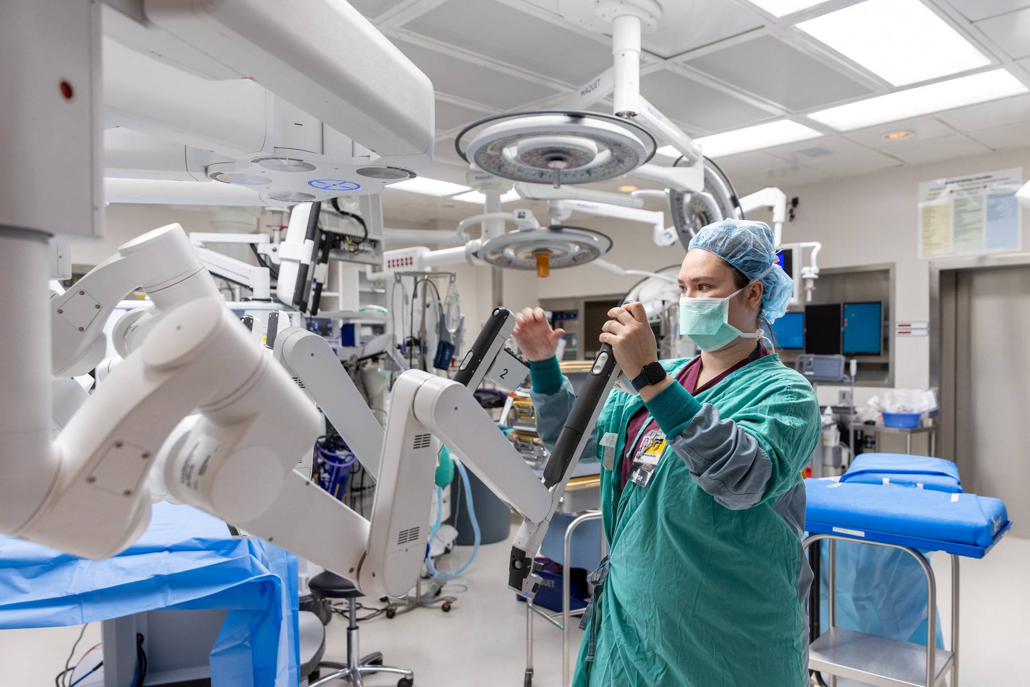 Robotics Nurse, Julie Delancey, RN, and nurse Megan Mulholland, RN, BSN prepare an Operating room and robot for a Robotic Prostatectomy at UIHC on Monday, November 7, 2022.