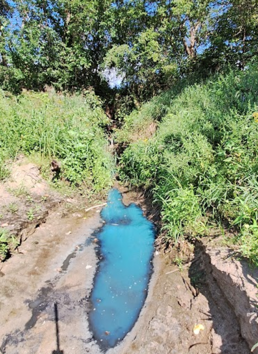 A bright blue pool of unidentified liquid near the East Nishnabotna River in Oakland