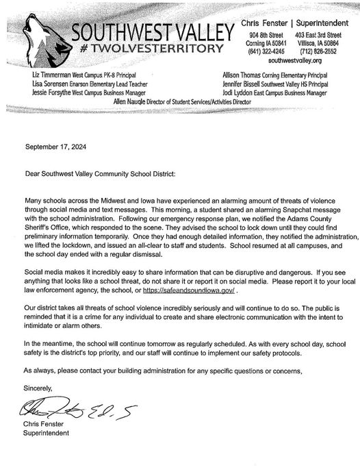 (Corning, Iowa) – Sheriff’s officials in Adams County are investigating a potential threat of violence in the Southwest Valley School District. The threat on social media was reported at the high school in Corning, Tuesday morning. School officials said the high school was made aware of a potential threat of violence via Snapchat to a student.