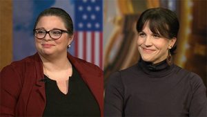 Sarah Nash of the Iowa Cancer Registry and Kelly Wells Sittig of the Iowa Cancer Consortium on the “Iowa Press” set. (Iowa PBS photo)
