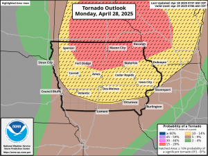 (Radio Iowa) – Iowans are being warned to be prepared for foul weather later today (Monday) and into tonight. National Weather Service meteorologist Rod Donavon says severe thunderstorms are possible across a wide section of the state. “We have a moderate risk out across northern Iowa, which is generally along and north of Highway 20, that is where the greatest risk for severe weather is at, and the rest of the state’s generally in an enhanced risk,” Donavon says. “We’re expecting storms to develop here later this afternoon, especially across northern Iowa, with the threat for few tornadoes, in addition to large hail and damaging winds.”
