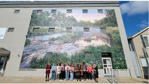 Sam Milroy owns the furniture shop where the mural was painted and says he hears all the time from people who love the mural. He likes that the mural is unique to Manchester. “Rather than saying we want this image that we’ve seen in another community somewhere else, or we want to be like, I saw this on vacation in Chicago, and can you do this in our community?,” he says. “I like that they went with something that’s, you know, imagery that is authentic to place. This is Manchester and it’s not Manchester. pretending to be another place or another community, but celebrating the things that are special about this part of Iowa.”