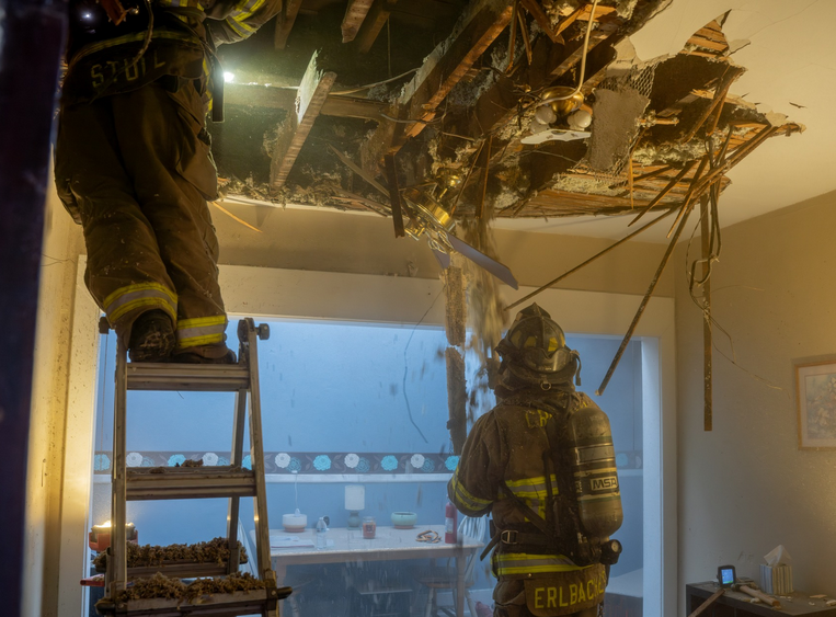 After pulling down the ceiling, firefighters found flames in the true 2×6 flat roof trusses and quickly extinguished them with a water can by 9:47 a.m. They also removed smoldering insulation from two rooms. Additional personnel arrived to assist with the overhaul, which involved removing debris. After clearing the insulation from the building, firefighters applied more water to the smoldering debris to ensure it was completely extinguished. The CFD cleared the scene and were back at the station by 12:28 p.m.