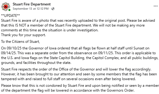 The flag had been lowered in accordance with a mandate from the Governor in memory of conservative political activist Charlie Kirk, who had been publicly assassinated Sept. 10. A separate order by the Governor mandated flags be flown at half staff on Sept. 11 for the anniversary of 9/11.