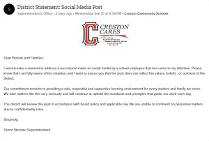 (Creston, Iowa) — An alleged incident involving a Creston Community School District employee’s social media post has resulted in the employee being placed on paid administrative leave.