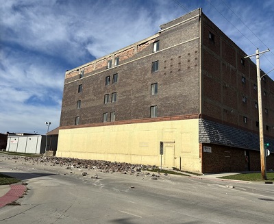 (Radio Iowa) – Part of the brick facade of a five-story warehouse in Fort Dodge collapsed Saturday, while security footage shows it narrowly missed a car that passed just moments before. Bricks from the structure landed on to the side of the street shortly before noon. Two streets surrounding the building remain closed as a precaution to motorists and pedestrians. It will remain closed until further notice. A picture on Facebook showed that the damage was not limited to just one side of the building.