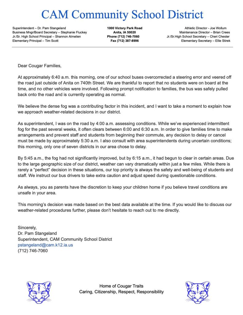 (Anita, IA) – CAM Community School District Superintendent Dr. Pam Stangeland, today (Thursday), said no injuries were reported after one of the District’s buses veered-off the road outside of Anita. The incident occurred at around 6:40-a.m. on 740th Street. In a news release on the District’s Facebook page, Dr. Stangeland said no students were on-board at the time, and no other vehicles were involved. The bus driver was not injured.