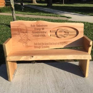 Voss said a trip around Atlantic with Atlantic Parks and Rec Director Roger Herring helped to narrow down the location for the bench. The bench, located on the northeast side of the park, near Santa’s cabin, includes a caricature of Bebensee created by cartoonist Brian Duffy and etched into the backrest, along with the carving of a square knot with the inscription says ‘Bob Bebensee, Troop 60 Scoutmaster, 1960-1964’. Bob tied the knot that kept us together through scouting’.
