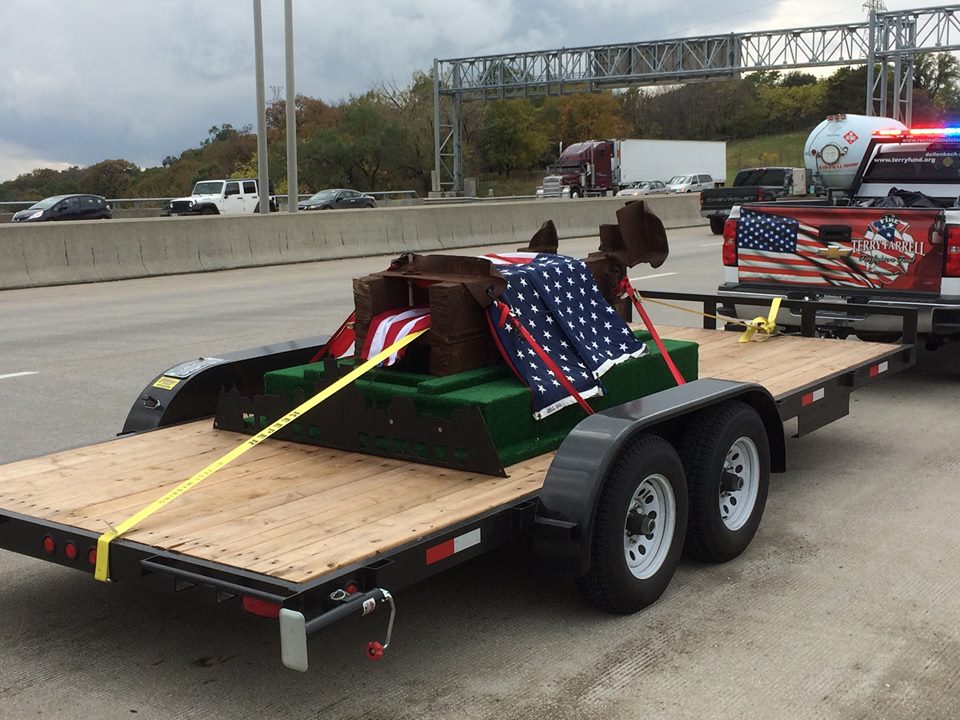 A five-foot long, more than 3,000-pound piece of steel which was part of a World Trade Center wall that fell during the 9-11 attacks, was carried on a trailer pulled by a pickup with custom graphics. An American flag covering the beam fluttered in the wind as it made its way west on I-80 between 1:30-and 2-p.m., today (Friday).