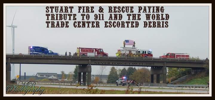 Members of the Marne Fire Department salute a piece of the World Trade Center as it goes by the Marne Interstate Exit to honor the fallen of 9/11. Photo courtesy Ashley Haupert