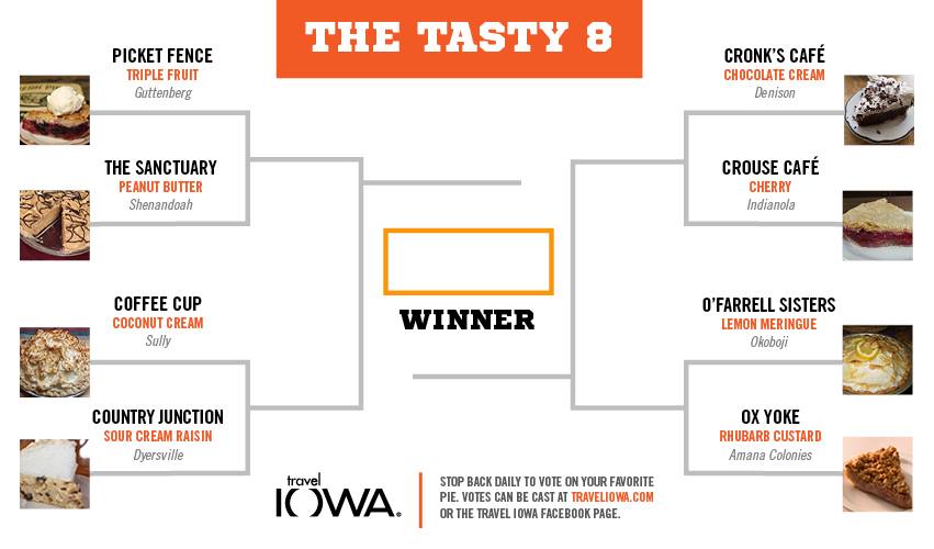 Starting today (Monday), fans of Travel Iowa on Facebook can cast their vote to determine the best pie in Iowa. Through Thursday, March 5, two pies will face off head-to-head in the “Tasty Eight” round. The slices receiving the most votes in each matchup will move on to the Final Four round, which starts Tuesday, March 10. The top two pies from those competitions will face off in the championship round to determine the best pie in Iowa. The winning slice will be announced on Saturday, March 14 – or Pi Day, mathematically speaking.