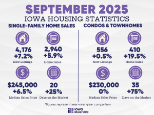 Compared to September of last year, there were 13-point-six percent more Iowa homes for sale last month. And that year-to-year comparison shows the average number of days a home is on the market was 25 percent higher in September. The median sales price for an Iowa home in September was 245-thousand dollars. That’s slightly lower than it was in August.