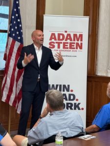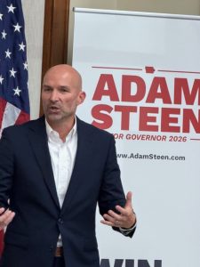 Adam Steen spoke to a crowd in Atlantic on Friday, October 10 as he campaigns for the GOP nomination to replace Governor Kim Reynolds. Steen, who grew up in Indianola and played professional baseball, also is an entrepreneur and business builder. He served in Governor Reynolds’ cabinet as Director at the Iowa Department of Administrative Services. He says his main message is simple.