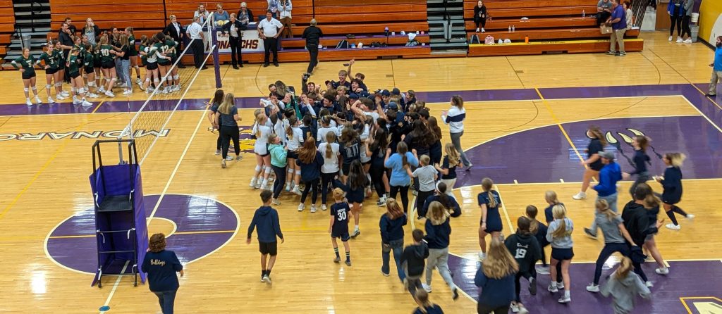 The second set was a bit more wild. Gehlen Catholic ripped off a 10-point rally midway through to lead 18-10. Riverside didn’t hang their heads and started chipping away at that lead. A five-point and 4-point run brought them all the way back to the lead at 23-22. Gehlen tied it at 23 but the Bulldogs scored the next two to complete the set comeback. Riverside Head Coach Brooke Flathers said that was a great momentum swing.