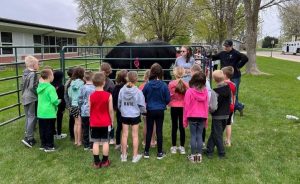 (Atlantic, Iowa) – On Friday, May 5th, the Atlantic FFA Chapter held a farm safety/petting zoo day at Washington Elementary. According to Atlantic FFA Reporter Lily Johnson, the event gave students at Washington Elementary the opportunity to experience being around large farm animals. They also got to learn about dangerous farm equipment and learn how to be safe when operating it and they heard about FFA and beef products, from the Cass County beef queen and princess.