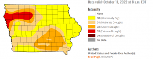 (Des Moines, Iowa) – The latest U-S Drought Monitor report shows conditions worsening across Iowa. The report, issued Thursday, said 100% of Iowa is experiencing abnormally dry conditions, marking the first time since August 2013 that all of the state has had some sort of drought designation. 57% of Iowa is experiencing moderate drought, an increase from 52% just a week ago, while 27% of Iowa is dealing with severe drought. 7% of Iowa has extreme drought. Plymouth, Cherokee, Buena Vista and Pocahontas Counties, along with parts of seven other counties in northwest Iowa, are included in the Extreme Drought conditions.