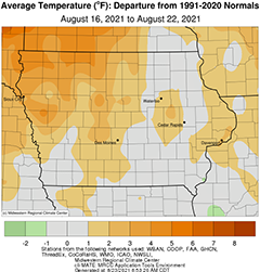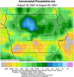 Above-average temperatures were observed across most of Iowa during the reporting period with a cool down from a cold frontal passage late in the week. The statewide average temperature was 72.7 degrees, 0.7 degrees above normal. Though most of the week was dry, a large-scale weather system brought widespread rainfall across Iowa with above-normal totals approaching two inches in drought-stricken northern Iowa; much of southern Iowa reported only a few tenths of an inch of rainfall.