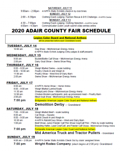 Deena Wells with Adair County ISU Extension and Outreach in Greenfield, today (Wednesday), released an updated schedule for the Adair County Fair, which takes place July 11-19. 2020 Adair Co Fair Schedule – Brenda As mentioned before, Wells says this year, the Adair County Fair will not be normal. Even so, she says they are working hard to provide a good experience for 4-H and FFA youth to showcase their hard work.