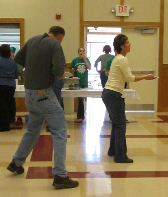Participation from community members is critical at the Pancake Supper to ensure the continual success of the Cass County Endowment and 4-H Program. Endowment Committee member Curt Behrends and Youth Action Committee chair Michelle Behrends catch their pancakes.