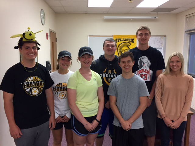 Jim Field visits with Atlantic High School seniors Megan Behrends, Nate Moen, Sam Coder, Garrett Franken, Mitchell Ginther, Emily Hohenberger and Bailey Schildberg.