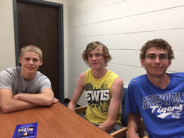 Jim Field visits with Griswold High School seniors Andy Hartman, Clay Amos and David Thompson.