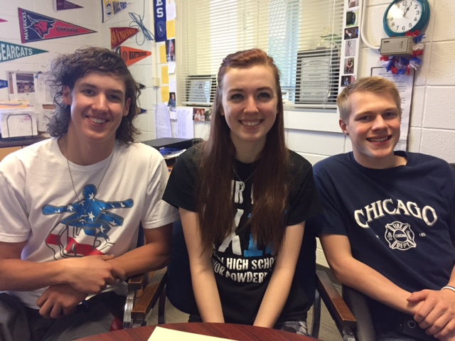 Jim Field visits with seniors Anthony Cordes, Grace Russmann and Ryan Pattee of A-H-S-T-W High School.