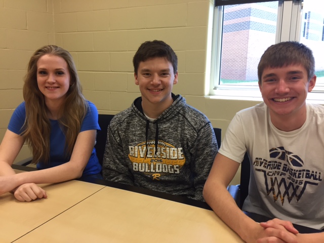 Jim Field visits with 2017 Riverside High School seniors Lucas Wilbur, Brent Pendgraft and Hannah Seifert.