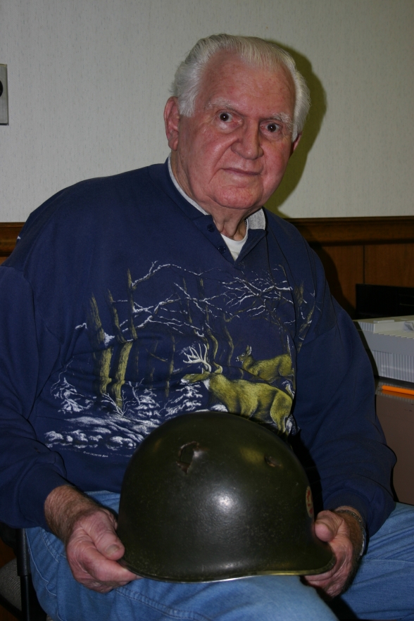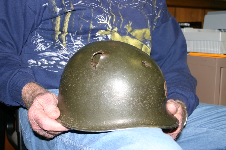 Bud holds the helmet he was wearing when he was shot by a German soldier. Miraculously, Bud was not injured.