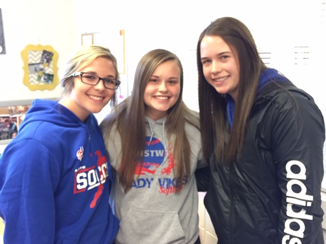 Jim Field visits with top AHSTW seniors Emma Jorgensen, Kyley Nelsen and Kate Wise.