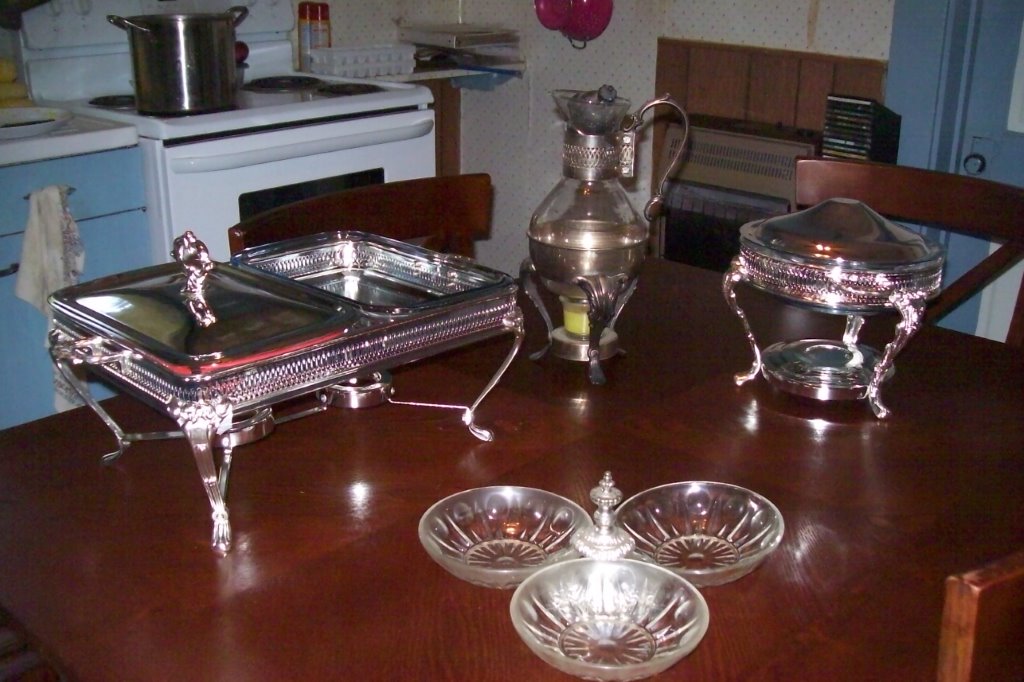 FOR SALE: table with 2 ends $35, hide-a-bed sofa $40, all wood dresser with 7 drawers $100. 243-3396