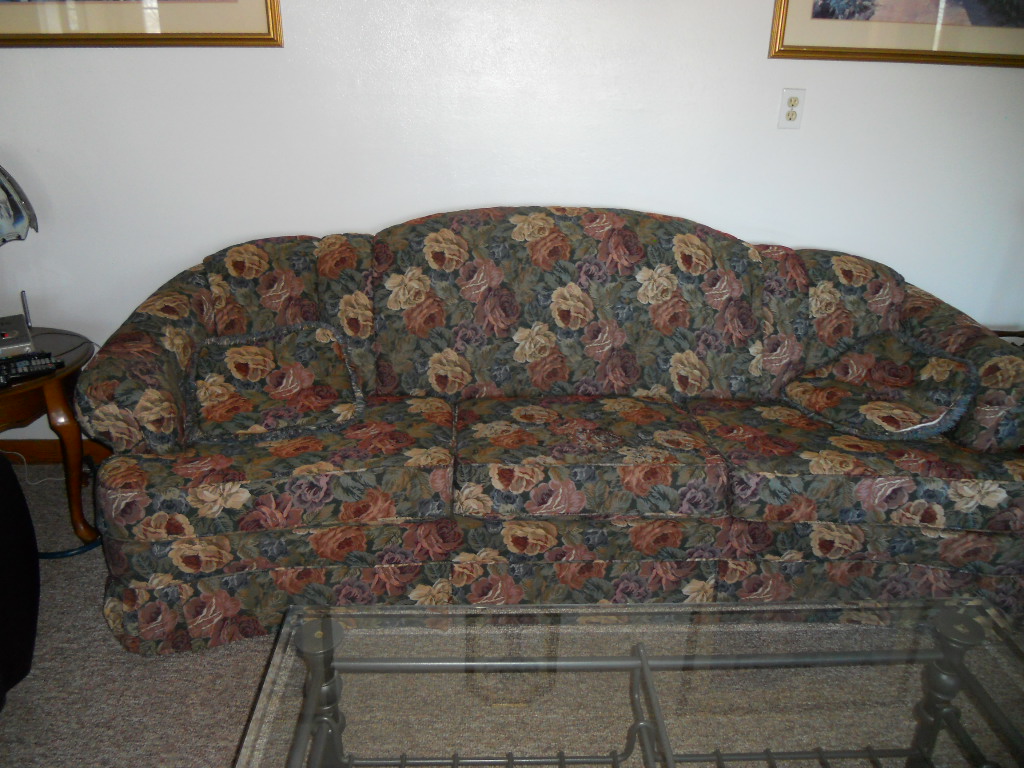 FOR SALE: Flowered sofa 93″ long, 33″ in depth, back is 35″ and 18″ in height where u sit. One cushion is a little worn. $25. Call 712-762-3142 in Anita.