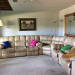 FOR SALE: Ashley tan leather 3 piece sectional, excellent condition. Couch is 7 feet long. Triangular piece is 5 feet long. Double recliner is 6 1/2 feet long. Has 4 recliners. Asking $400. Call 712-249-1000. SOLD!