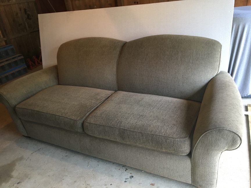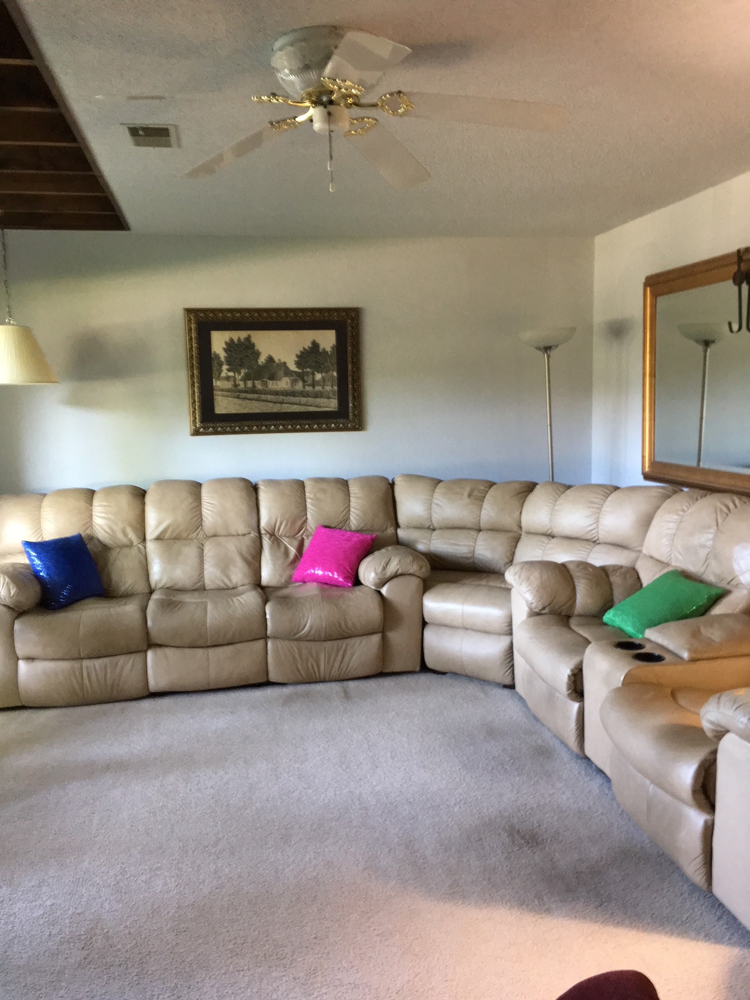 FOR SALE: Ashley tan leather 3 piece sectional, excellent condition. Couch is 7 feet long. Triangular piece is 5 feet long. Double recliner is 6 1/2 feet long. Has 4 recliners. Asking $400. Call 712-249-1000. SOLD!