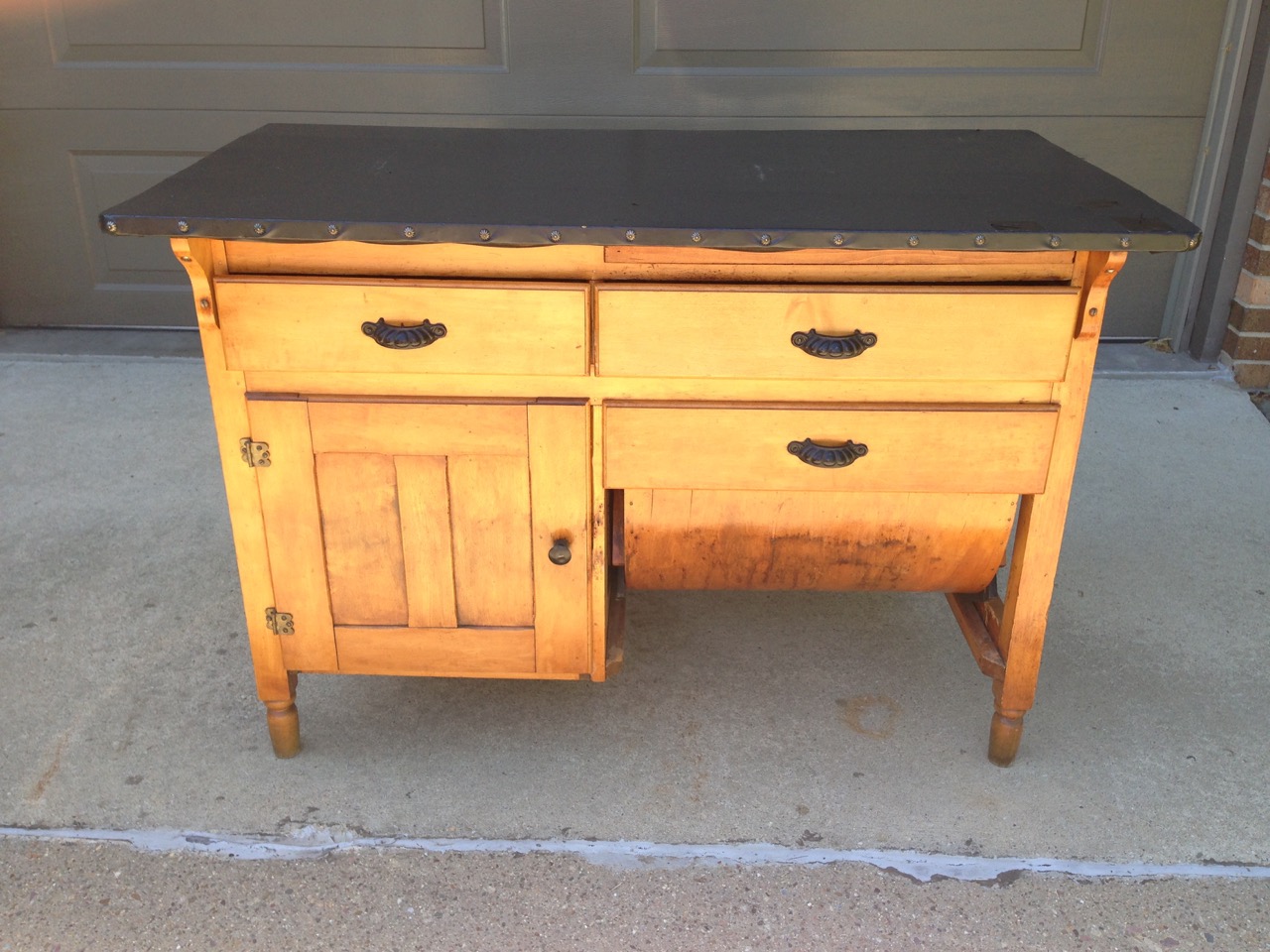 FOR SALE: Vintage Hoosier Cabinet Base- $150. Beautiful base for vintage hoosier cabinet. Currently has a black vinyl top but can easily be removed if desired. Nice hardware on the drawers. It works well for storage and display your favorite items or books on the top. Call 805-490-7096 with questions.