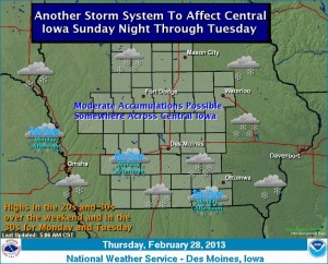 We will still see light snow or flurries over mainly Eastern Iowa today from the Tuesday system. After a brief break over the weekend another storm system will be taking shape and will affect the upper Midwest and Northern plains beginning Sunday night and ending early Tuesday. This system will have the potential to produce moderate to even locally heavy snowfall and it passes Iowa but it is too early to determine exactly where the heaviest snow will fall.