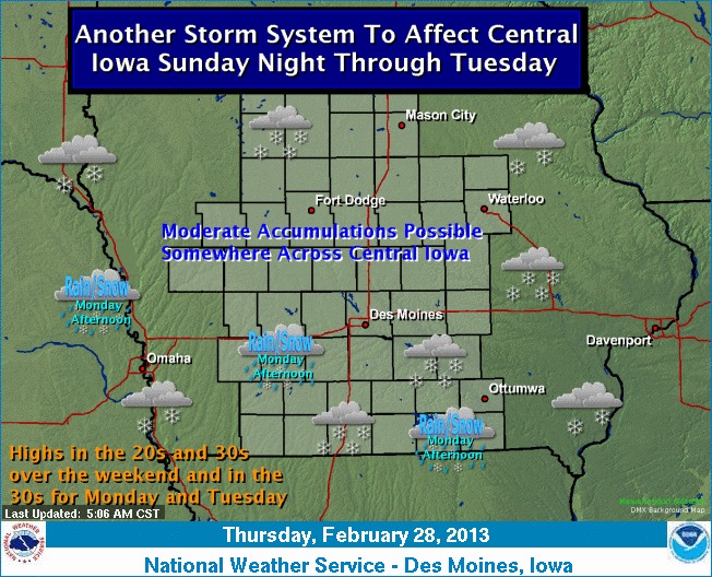 Officials with the National Weather Service in Des Moines say it appears that central Iowa will not get a break in the action.