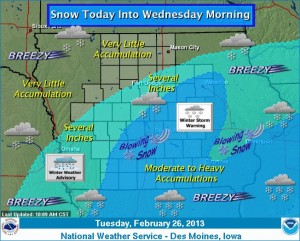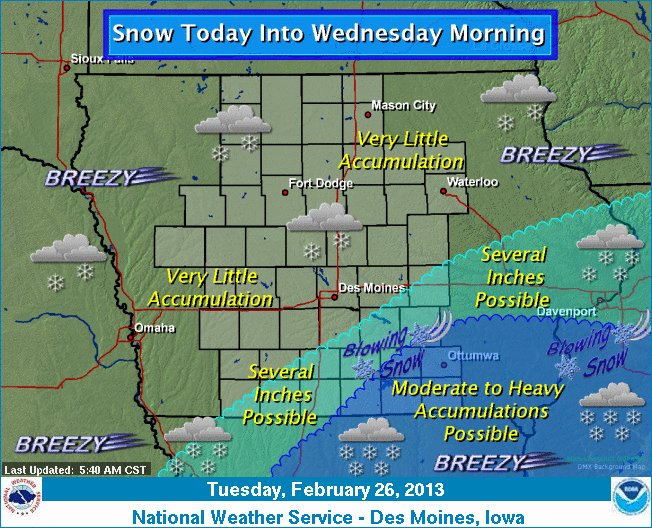NATIONAL WEATHER SERVICE DES MOINES IA 846 AM CST TUE FEB 26 2013 ...SNOW AND BLOWING SNOW TO AFFECT PORTIONS OF CENTRAL IOWA TODAY AND TONIGHT... .LOW PRESSURE WILL MOVE THROUGH ILLINOIS TODAY BRINGING SNOW TO PORTIONS OF CENTRAL IOWA TODAY INTO TONIGHT. INCREASING NORTH WINDS WILL CAUSE SIGNIFICANT BLOWING AND DRIFTING SNOW ACROSS THE AREA THROUGH THE DAY...WITH TRAVEL CONDITIONS BECOMING DIFFICULT IN MUCH OF THE HEADLINE AREA. IAZ038-039-048>050-059>061-071>073-081-082-092-262300- /O.EXA.KDMX.WW.Y.0003.000000T0000Z-130227T1200Z/ GRUNDY-BLACK HAWK-STORY-MARSHALL-TAMA-DALLAS-POLK-JASPER-ADAIR- MADISON-WARREN-ADAMS-UNION-TAYLOR- INCLUDING THE CITIES OF...GRUNDY CENTER...WATERLOO...AMES... MARSHALLTOWN...TOLEDO...ADEL...DES MOINES...NEWTON...GREENFIELD... WINTERSET...INDIANOLA...CORNING...CRESTON...BEDFORD 846 AM CST TUE FEB 26 2013 ...WINTER WEATHER ADVISORY IN EFFECT UNTIL 6 AM CST WEDNESDAY... THE NATIONAL WEATHER SERVICE IN DES MOINES HAS ISSUED A WINTER WEATHER ADVISORY FOR SNOW AND BLOWING SNOW...WHICH IS IN EFFECT UNTIL 6 AM CST WEDNESDAY. * SHORT TERM TRENDS...SNOW WILL CONTINUE ACROSS THE ADVISORY AREA THROUGH THE MORNING AND INTO THE AFTERNOON. THE SNOW WILL BE HEAVY AT TIMES WITH SNOWFALL RATES OF UP TO AN INCH PER HOUR. * STORM TOTAL SNOW ACCUMULATIONS...SNOWFALL ACCUMULATIONS OF 3 TO 6 INCHES ARE EXPECTED WITH THE HEAVIEST AMOUNTS ON THE SOUTHEAST SIDE OF THE ADVISORY. * WINDS/VISIBILITY...NORTH TO NORTHEAST WINDS OF 15 TO 30 MPH WITH HIGHER GUSTS ARE EXPECTED TO CAUSE BLOWING AND DRIFTING OF SNOW AND REDUCE VISIBILITY UNDER ONE QUARTER MILE AT TIMES THROUGHOUT MUCH OF TODAY. * IMPACTS...TRAVEL CONDITIONS WILL DETERIORATE QUICKLY AS THE SNOW CONTINUES THROUGH THE MORNING HOURS. PRECAUTIONARY/PREPAREDNESS ACTIONS... A WINTER WEATHER ADVISORY FOR SNOW AND BLOWING SNOW MEANS THAT VISIBILITY WILL BE LIMITED DUE TO A COMBINATION OF FALLING AND BLOWING SNOW. USE CAUTION WHEN TRAVELING...ESPECIALLY IN OPEN AREAS.