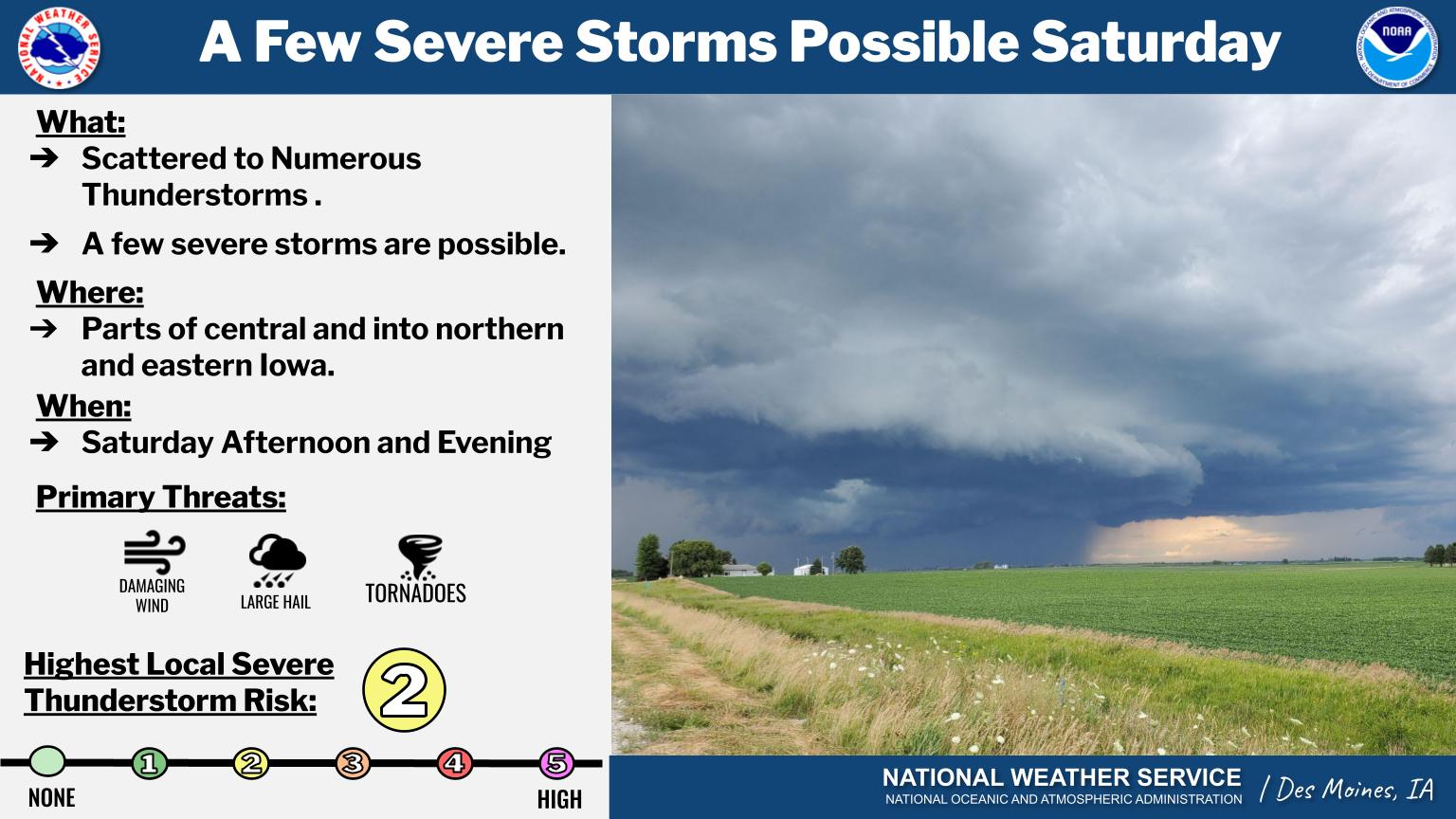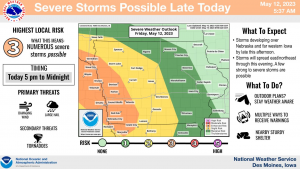 (Des Moines, Iowa) -The National Weather Service, in their Hazardous Weather Outlook, says scattered thunderstorms are expected to develop over western Iowa late this afternoon and spread into parts of central Iowa through the evening hours. A few strong to severe storms are possible with large hail and damaging winds. A low tornado threat does exist.