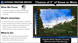 (Radio Iowa) – Forecasters say another storm system is expected to reach the state later this week that could bring snow across Iowa’s northern half and rain to the south. Meteorologist Cory Martin, at the National Weather Service, says the divider line between snow and rain runs from Council Bluffs to Des Moines to Cedar Rapids to Dubuque, but just a few degrees shift in the temperature could make all the difference.