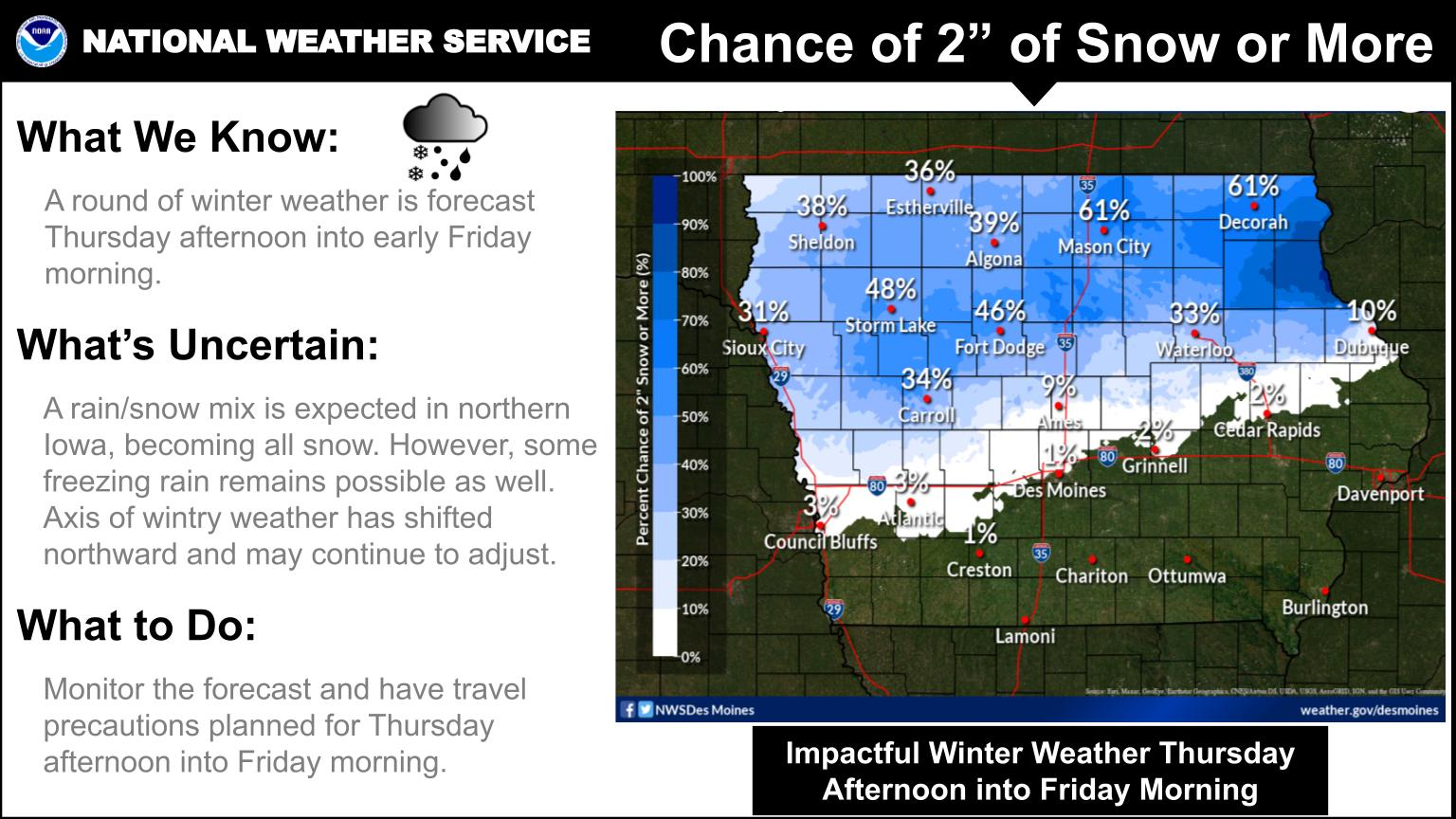 “Thursday night into Friday morning, temperatures may cool enough to allow that rain-snow line to sink further south and into central Iowa,” Martin says, “so, still quite a bit of uncertainty there and just how far south we’re going to see snow, just because we’re talking the difference of just a degree or two.” Wide sections of north-central and northeast Iowa may see two or more inches of snow, which could make driving hazardous from Mason City to Decorah.