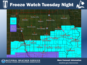 The National Weather Service has issued a FREEZE WATCH in effect, primarily from 7-p.m. Tuesday through 10-a.m. Wednesday in most counties.