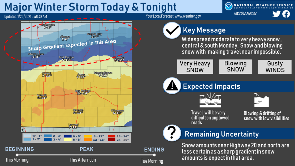 The greatest uncertainty is north of a Fort Dodge to Waterloo line and is why there are large ranges of snowfall expected in those areas. Snow amounts in Mason City, Algona and Estherville areas will likely be on the lower side of the ranges. The snow will be accompanied by brisk winds and blowing snow producing low visibilities in open areas. Travel will be difficult to near impossible on unplowed roads in the heavy snow areas, even not taking into account low visibilities and at times, whiteout conditions. This evening’s commute will be greatly impacted. Light snow will linger Tuesday morning and breezy winds will linger and will prolong the recovery time for this event.