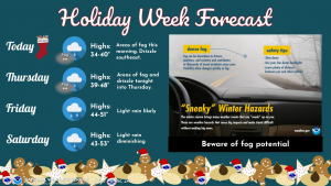 Christmas Day: Patchy fog through about 1-pm, otherwise cloudy, with a high near 38. Southeast winds 5 to 10 mph.